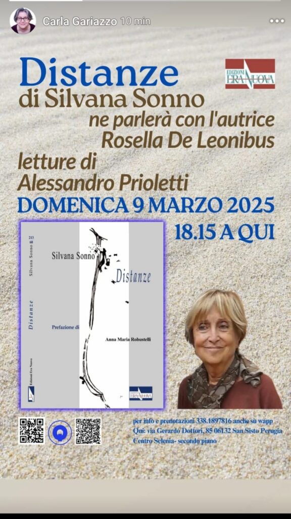 “Distanze”, di Silvana Sonno, ultima produzione poetica (EraNuova 2025), con prefazione di Anna Maria Robustelli, raccoglie una ottantina di poesie, composte in periodi diversi, quasi un diario di vita. L’ha presentata a “Qui”, di Perugia – spazio alternativo laboratoriale, espositivo e teatrale – la psicologa e psicoterapeuta Rosella De Leonibus che ha stimolato la poeta […]