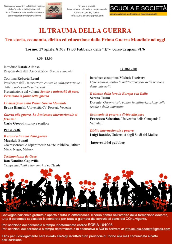 A Torino, il 17 aprile dalle ore 8.30 alle 17.00, presso Fabbrica delle “E” corso Trapani 91/b si svolgerà il convegno dal titolo “Il trauma della guerra. Tra storia, economia, diritto ed educazione dalla Prima Guerra Mondiale ad oggi“.Il convegno di formazione è organizzato dall’Osservatorio contro la militarizzazione delle scuole e delle università insieme a Scuola e […]