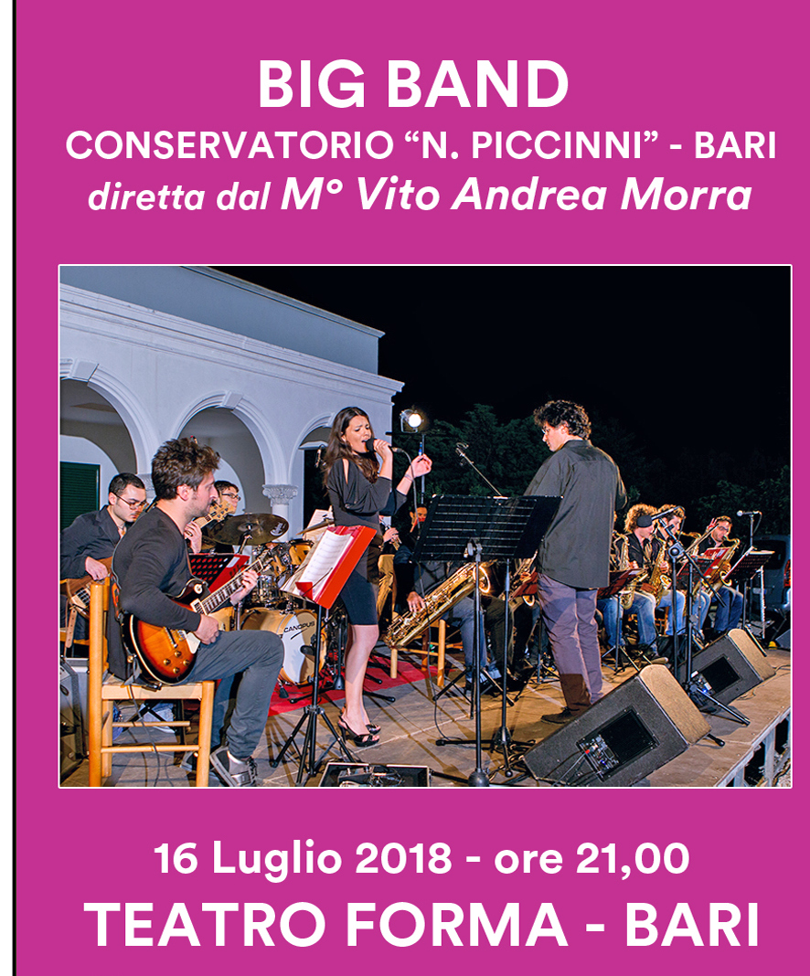 Lunedì 16 la Big Band del Conservatorio N. Piccinni di Bari, sezione Musica Jazz, sotto la direzione del M° Vito Andrea Morra, si esibirà alle 21,00 al Teatro Forma. Gli inviti per il concerto, realizzato proprio per il quartiere Libertà, possono essere ritirati presso l’Oratorio Salesiano Redentore o telefonando all’Associazione “Nel Gioco del Jazz” al 3389031130.