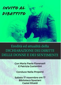 Durante questo incontro per il 170° anniversario  della Dichiarazione dei Diritti delle donne e dei Sentimenti del 1848 (stesa da Elizabeth C. Stanton e Lucretia C. Mott e approvata, con Deliberazioni, in due Convenzioni Seneca Falls e Rochester)  Maria Paola Fiorensoli e Patrizia Costantini rivisitano oltre a questo  testo fondamentale del femminismo liberale americano anche la precedente Dichiarazione dei diritti della Donna e della Cittadina, di Olympe de Gouges.   Questi due documenti costituiscono la base, teorica e pratica, delle rivendicazioni frutto del protagonismo femminile in due Rivoluzioni (Francese e Americana).