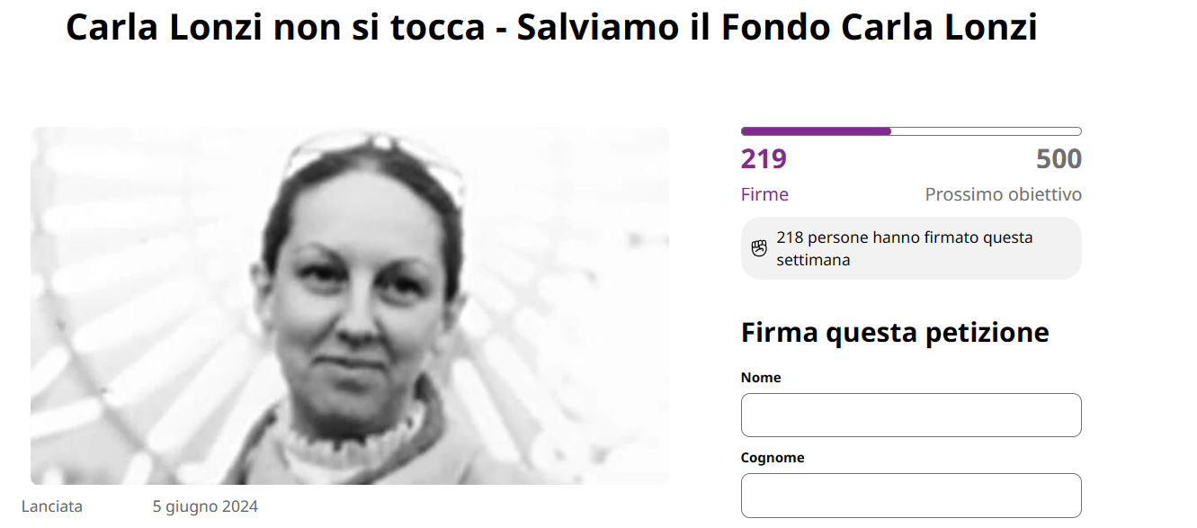 Salvare il Fondo Carla Lonzi, la mobilitazione perché resti pubblico un grande patrimonio documentale del femminismo, dell’arte e della letteratura contemporanea La redazione 10 Giugno 2024 Leggi Tutto »