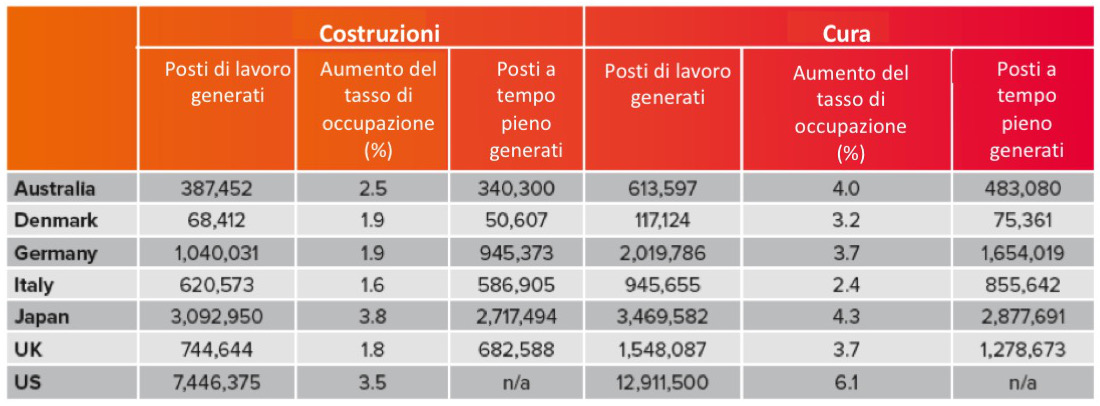 Gli effetti indiretti sull’occupazione, indotti dall’acquisto di beni intermedi, sono ovviamente maggiori per il settore delle costruzioni – il settore della cura consiste prevalentemente di lavoro e usa meno beni intermedi – e vi è, nei due casi, una prevalenza di occupazione maschile.