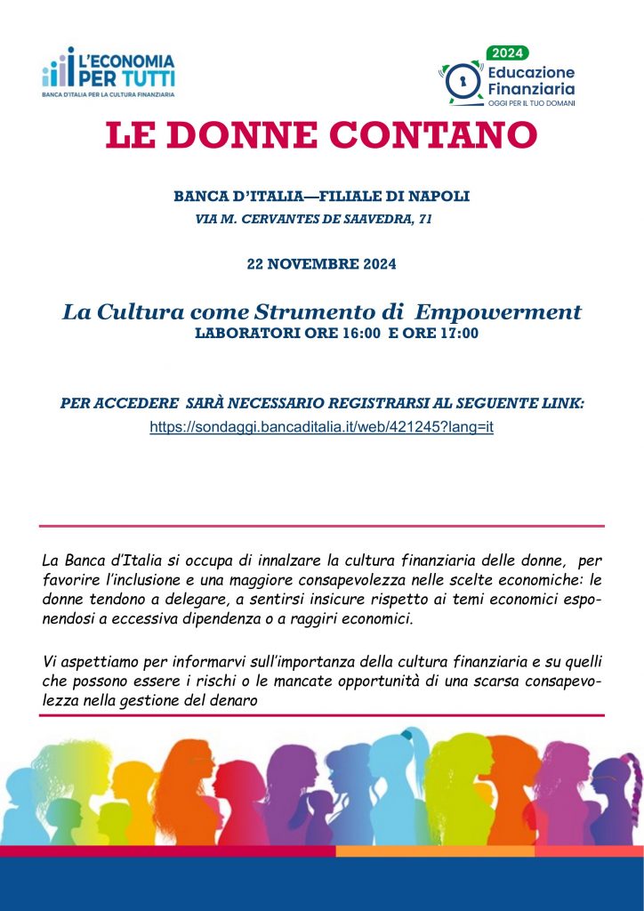 “Le donne contano” – iniziativa di educazione finanziaria a favore delle donne della Banca d’Italia – anche in Campania dal 22 novembre 2024. Due laboratori si svolgeranno presso la Filiale di Napoli (via Cervantes, 71), rivolti sia agli operatori delle associazioni (che svolgerebbero una funzione di ambasciatori sul tema a favore delle associate), sia alle associate stesse.