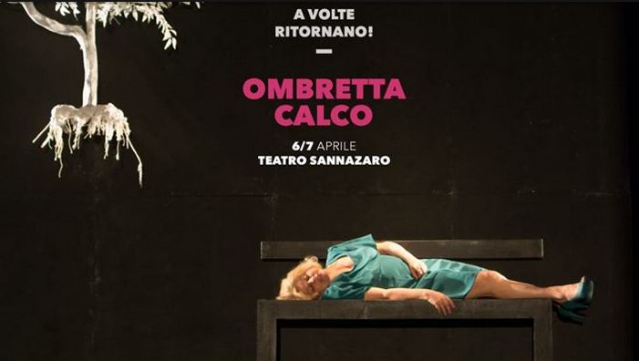 Ombretta Calco di Sergio Pierattini con Milvia Marigliano, regia di Peppino Mazzotta, scene Roberto Crea, costumi Rita Zangari, disegno luci Paolo Carbone, scenotecnica Angelo Gallo, tecnico luci Antonio Molinaro, organizzazione e distribuzione Officine Vonnegut, una produzione Rossosimona, date 6, 7 aprile, orari venerdì e sabato ore 21