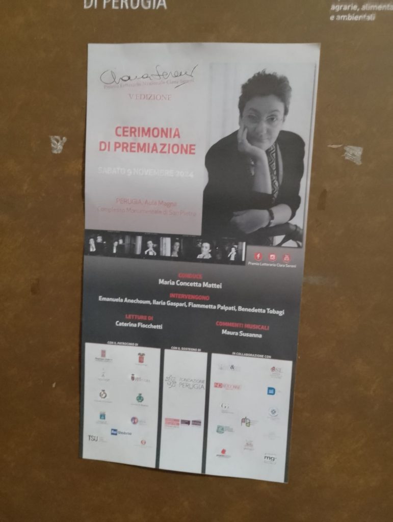 Con una cerimonia nell’nell’Aula Magna del complesso monumentale di San Pietro, condotta dalla giornalista e conduttrice televisiva Maria Concetta Mattei, si è svolta a Perugia, sabato 9 novembre, la proclamazione e premiazione dei vincitori della V edizione del Premio Letterario Nazionale Clara Sereni.