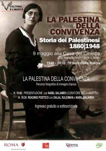 Il 70° della Nakba del 1948, drammatica cesura nella storia della Palestina, è l’occasione per presentare il paese e il suo popolo, nei decenni precedenti la catastrofe (1880 – 1948) In 22 pannelli, illustrati da immagini fotografiche d’epoca inedite e da una documentazione storica rigorosa, vengono narrate le vicende vissute in Palestina dal periodo dell’Impero Ottomano a quello del Mandato Britannico e che hanno portato, attraverso la Grande Rivolta Araba, la repressione e la pulizia etnica fino alla “Scomparsa della Palestina” . Un percorso fotografico costruito con gli occhi di chi l’ha vissuta e di chi l’ha fotografata. Le persone e le cose ritratte in questi scatti hanno consegnato alla storia una testimonianza unica e vera per il solo fatto di essere stati fotografati. Negli scatti di Karima Abud, prima fotografa palestinese, che visse a Nazareth fra il 1896 e 1955, incontriamo i volti della Palestina colta e borghese, emancipata e aperta alla vita e alla modernità. Negli scatti di Felix Bonfils, scrittore e fotografo francese, scopriamo la Palestina urbana e rurale, con i suoi campi coltivati, con le sue fortificazioni maestose, con la sua varietà di persone e etnie. Tutti gli scatti sono testimoni parziali e inconfutabili di un paese vivace, lanciato verso la modernità e inserito nel suo contesto regionale e internazionale, soggetto al flusso e riflusso di civiltà e culture. Dalal Suleiman, attrice di origini palestinesi, e Nabil Salameh, cantautore e giornalista palestinese, curatore della mostra, introducono il pubblico nel mondo evocato dal percorso fotografico, con letture di autori e autrici palestinesi e siriani, interpreti profondi e appassionati della cultura araba.