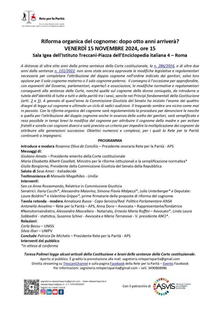 Organizzato dalla Rete per la Parità, venerdì 15 novembre dalle ore 15, presso la Sala Igea dell’Istituto Treccani, piazza dell’Enciclopedia italiana n. 4, Roma, si svolgerà il convegno organizzato dalla Rete della Parità sulla riforma organica del cognome.