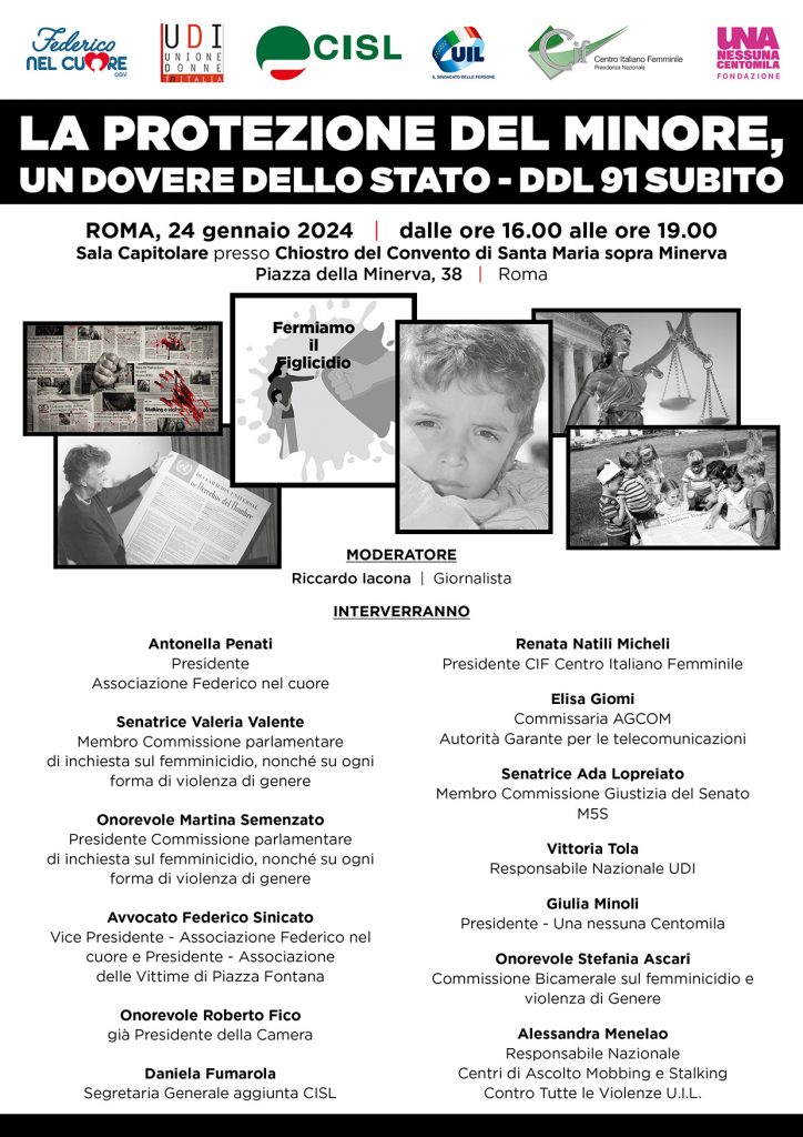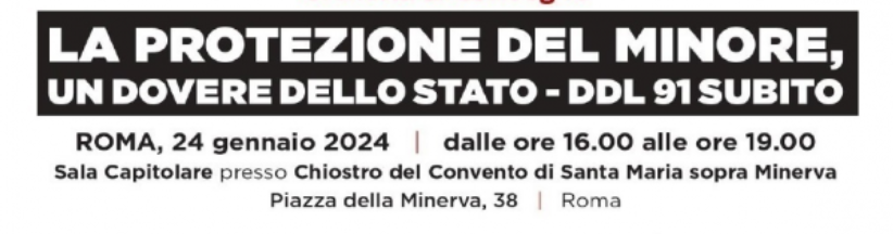 Su iniziativa della senatrice Valeria Valente, già presidente della commissione parlamentare d’inchiesta sul femminicidio, Giovedì 24 gennaio, dalle ore 16.00, si svolgerà a Roma, presso la Sala Capitolare – Chiostro del Convento di Santa Maria sopra Minerva (piazza della Minerva, 38), il convegno “La protezione del minore, un dovere dello Stato”.