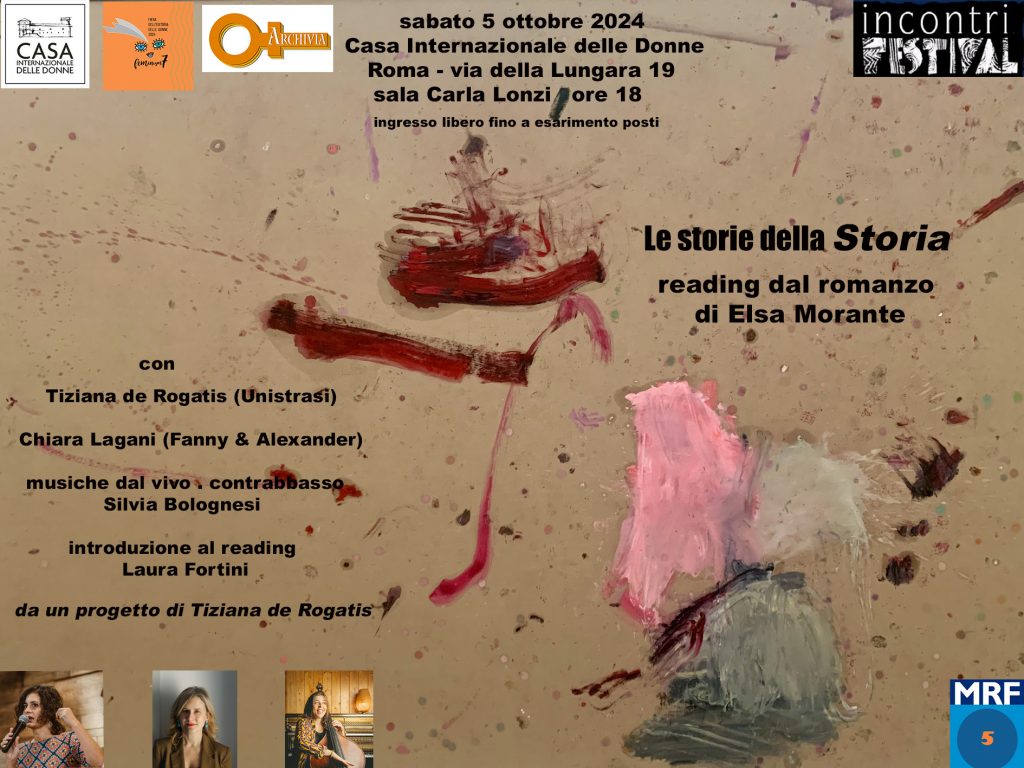 Sabato 5 ottobre, alle 18.00, presso la Casa internazionale delle donne di Roma (via della Lungara, 19) un reading dal titolo “Le storie della Storia” celebrerà La Soria di Elsa Morante nel cinquantenario del libro (1974-2024).