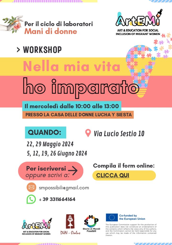 “Nella mia vita ho imparato”, il secondo laboratorio ARTEMI – Art and Education for social inclusion of MIgrant women, inizia il prossimo mercoledì 22 Maggio presso la Casa delle Donne Lucha y Siesta, in via Lucio Sestio 10 a Roma.