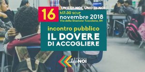 Vi segnalo che a Roma in via della Stazione Tuscolana 84 il 16 novembre 2018 si terrà l’incontro pubblico “Sei 1 di Noi”: Il dovere di accogliere.