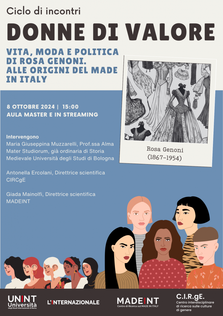 Martedì 8 ottobre, alle ore 15.00, presso UNINT – Università degli Studi Internazionali di Roma – per il ciclo “Donne di valore” un incontro dedicato a Rosa Genoni: “Vita, moda e politica di Rosa Genoni. Alle origini del made in Italy”.