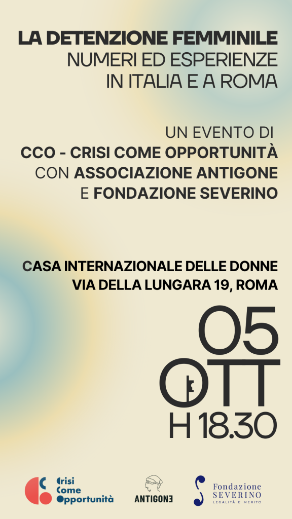 In un evento a cura di Crisi Come Opportunità, in collaborazione con l’associazione Antigone e la fondazione Severino, il 5 ottobre, alle ore 18.30, presso la Casa internazionale delle donne (via della Lungara, 19), sarà presentato il primo “Rapporto sulle donne detenute dell’Associazione Antigone”, un momento di riflessione su numeri, storie ed esperienze delle donne […]