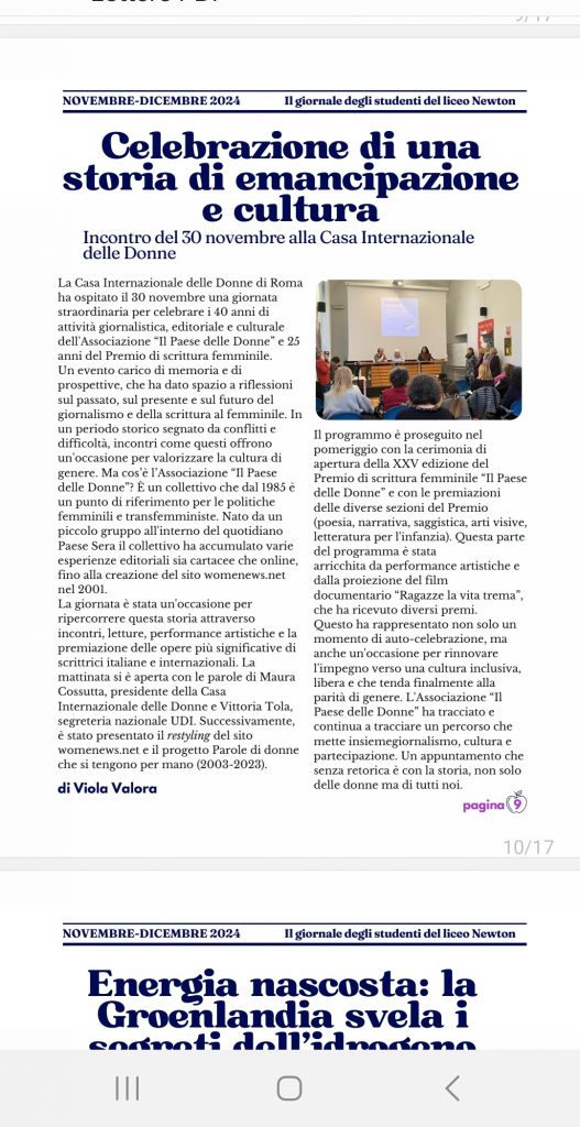 Sulla giornata del 30 novembre 2024, in cui abbiamo festeggiato i 40 anni del Paese delle Donne e i 25 anni dell’omonimo Premio di scrittura femminile, il resoconto scritto per il suo giornale, “Il giornale degli studenti del liceo Newton” di Roma, da Viola, 14 anni, con la quale ci complimentiamo e che ringraziamo per […]